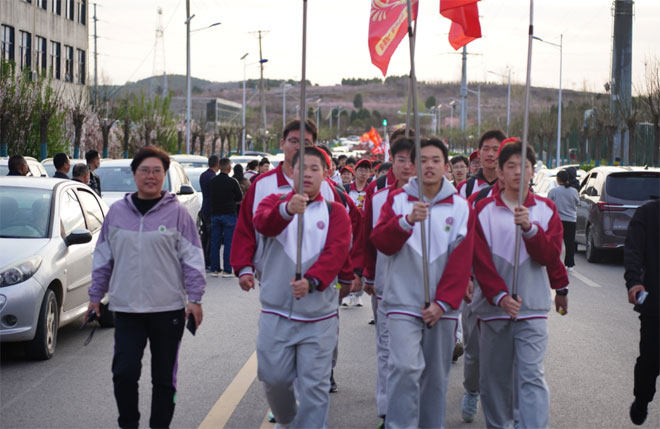 行进途中,春风迎面,杨柳招展,桃花绽放,一面面班旗迎风飘展,同学们的欢声笑语,加之传出的励志歌声,让整个远足朝气蓬勃。校领导在前方引领,老师们在队中守护,同学们并肩而行,大手牵小手,文明伴我行。